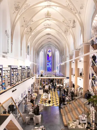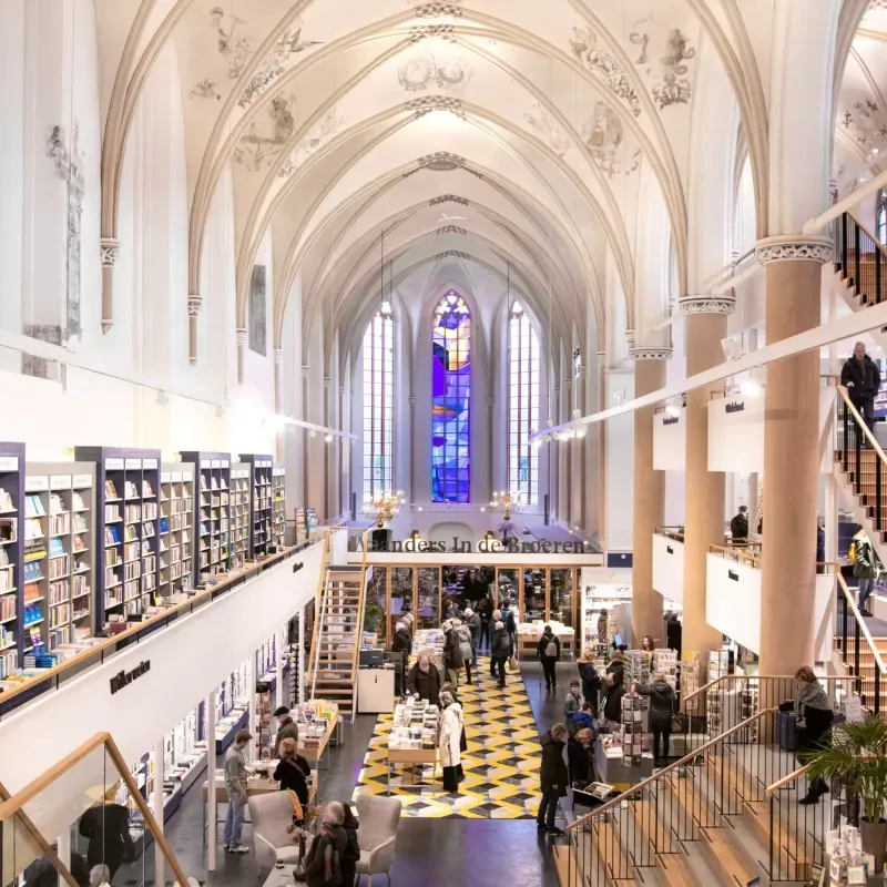 Een historische kerk omgetoverd tot boekwinkel met gewelfde plafonds en glas in lood. Rust in de vorm van papier. Zo’n plek waar je binnenloopt voor één titel… en met vijf naar buiten wandelt. Echt een heaven for booklovers.